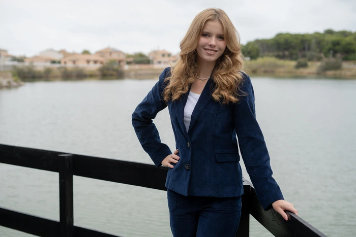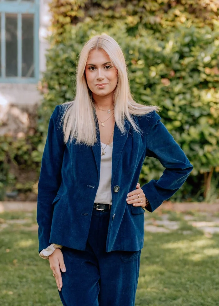 Corenthine porte une taille 38 et mesure 1m70 (Blazer Ilona marine)