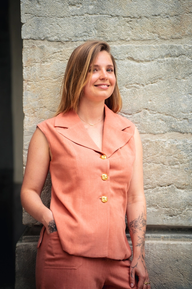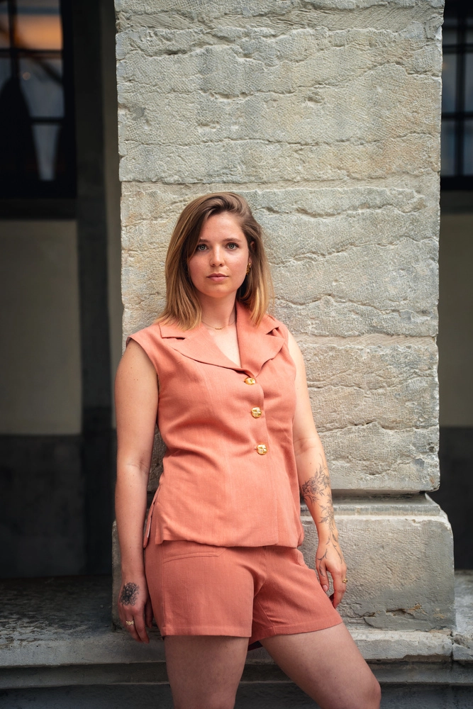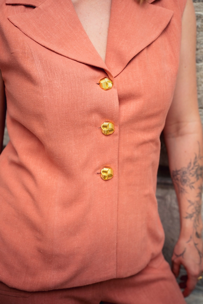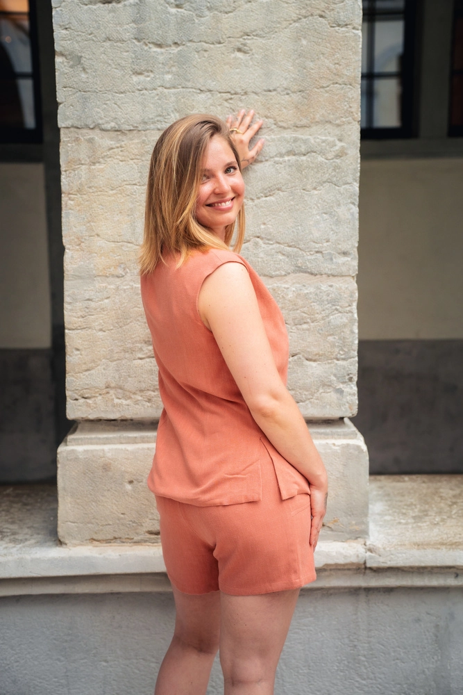 La coupe sans manches est pensée pour les journées de chaleur qui laisse circuler l’air, la peau respire, on reste fraîche. Et pourtant on est habillée. C’est ça, la promesse du Gilet Luna : l’élégance sans la contrainte.