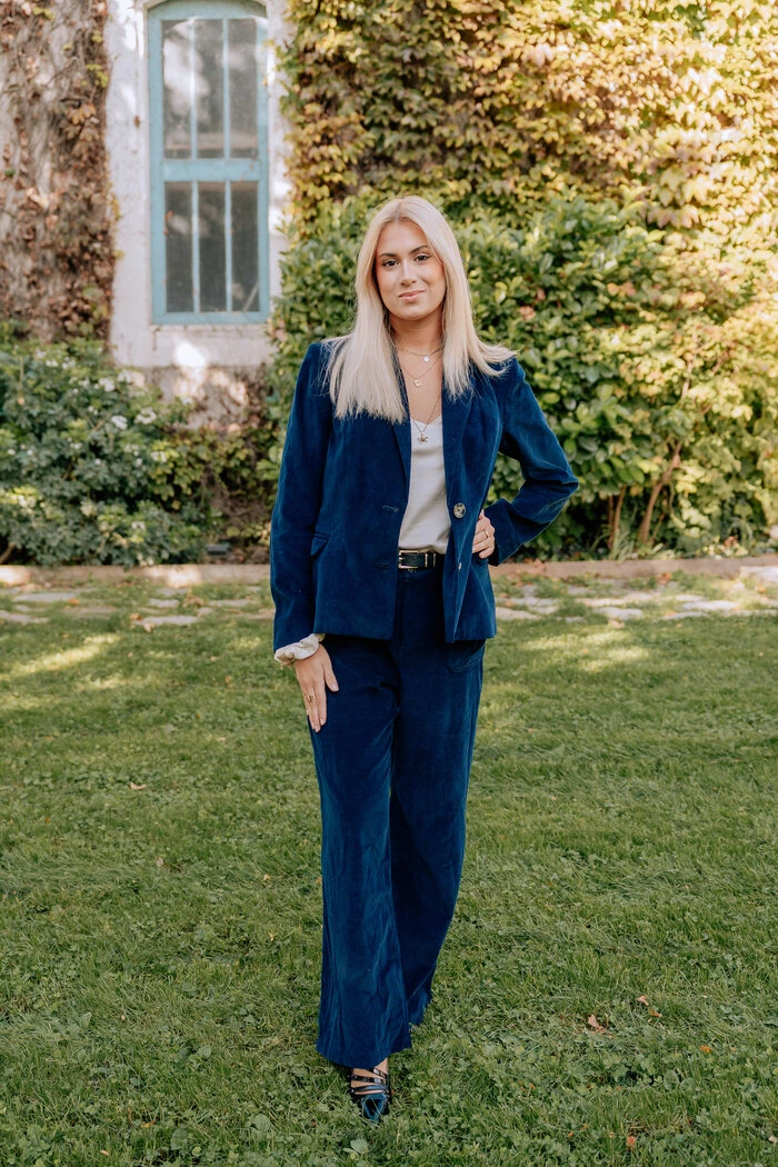 Sa taille haute et sa coupe ajustée mettent en valeur la silhouette tout en assurant un confort optimal. Les poches latérales discrètes ajoutent une touche pratique, tandis que la finition soignée témoigne de l’attention portée aux détails. Le velours de coton apporte une allure chic et élégante, que vous pouvez facilement associer avec une blouse fluide pour un look sophistiqué ou un t-shirt basique pour une tenue décontractée.