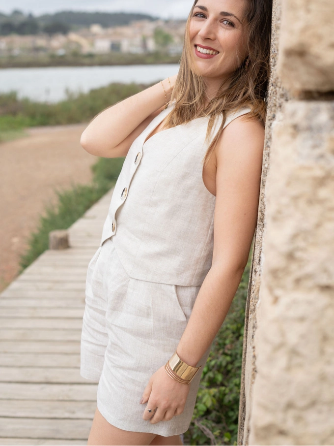 J’ai opté pour l’ensemble gilet et short ! Un ensemble que j’adore, un véritable coup de cœur pour cet été, facile à porter autant pour un événement que pour tous les jours.